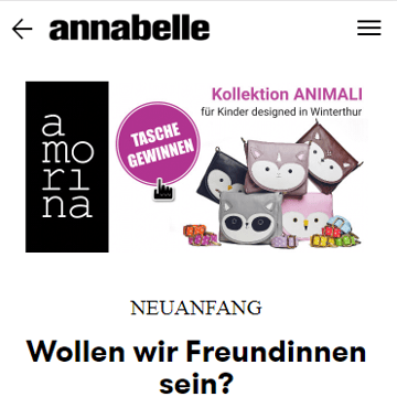 Medien · 14. Juli 2018 Annabelle Bei Annabelle ist unsere Werbung online gestartet. Das Feedback ist grossartig und 2 Teilnehmer wurden mit einer ANIMALI Tasche glücklich gemacht. tagPlaceholderTags: